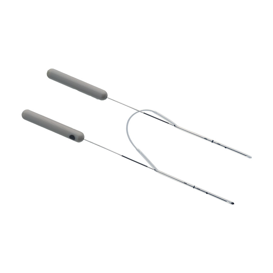 Exemple de sonde d’intubation bi canaliculaire mise en place sous anesthésie pour dilater les voies lacrymales sténosées et utilisées par le Docteur Hauth :
