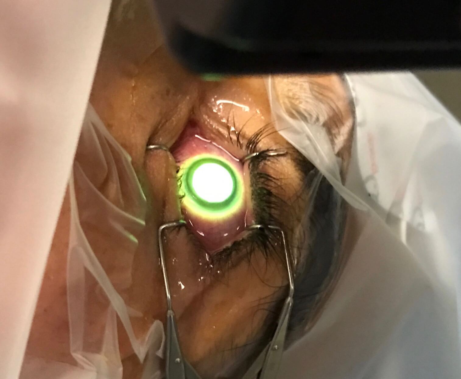 Traitement du collagène (pontage chimique des fibrilles par des liaisons covalentes) sous anesthésie locale topique et en ambulatoire.